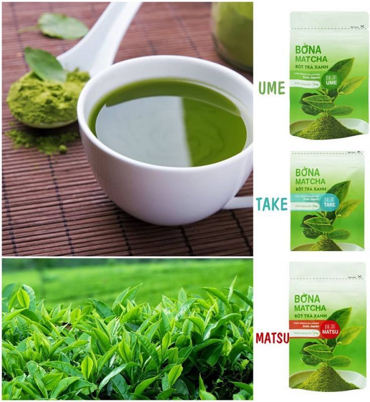 Bột trà xanh Bona Matcha "UME - TAKE - MATSU", 100% từ lá trà xanh Nhật Bản. Tuyệt đối không có chất bảo quản. (Ảnh: Plus Mainichi)