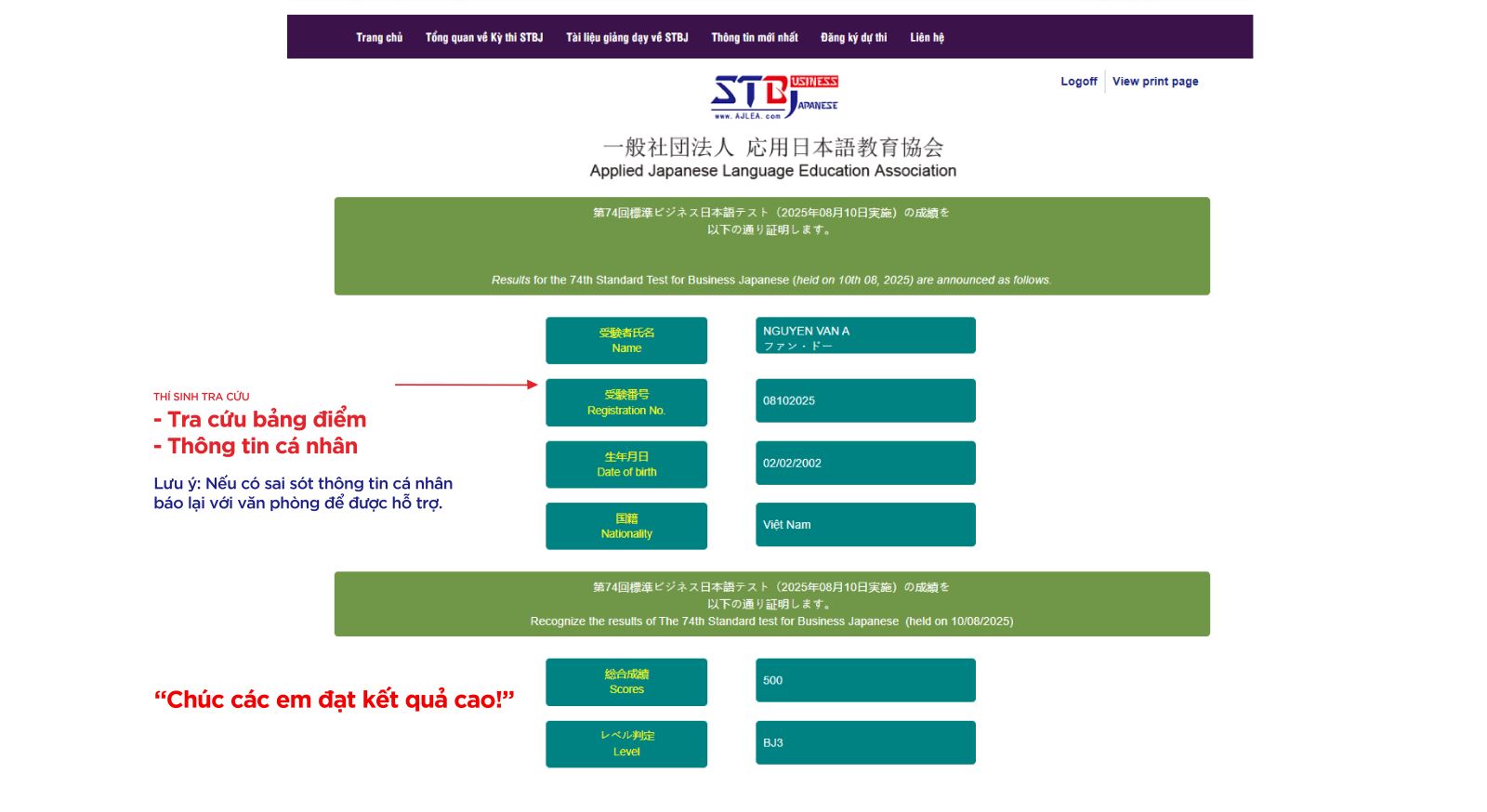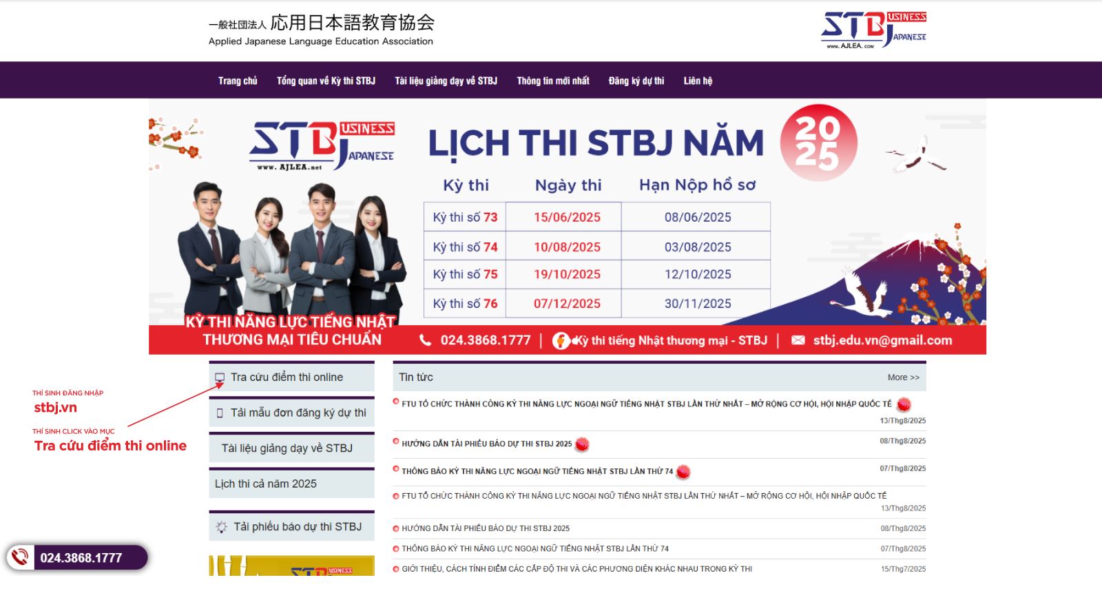 Cách tra cứu điểm thi STBJ Bước 1: Thí sinh đăng Nhập vào website STBJ và làm Click :Tra cứu điểm thi Online Bước 2: Thi Sinh đăng nhập thông tin theo Hướng dẫn: - Số tài khoản: số báo danh khi tham gia kỳ thi - Mật khẩu: Căn cước công dân hoặc hộ chiếu khi đăng ký kỳ thi Bước 3: Thí sinh nhận bảng điểm và check lại các thông tin lưu ý: Nếu có sai sót thông tin cá nhân báo lại với văn phòng để được hỗ trợ Chúc các em đạt kết quả tốt!
